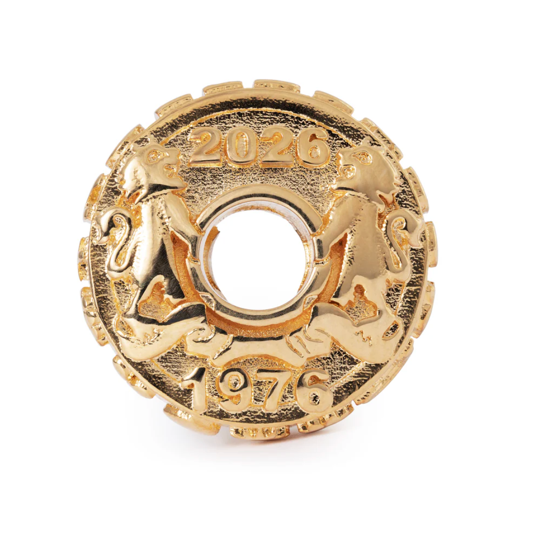This is a special coin bead with luxurious gold plating to celebrate our golden Jubilee celebration. The years 1976 and 2026 are engraved on the bead to mark five decades of creativity, community, and craftsmanship. On the rim of the bead, Trollbeads is engraved.